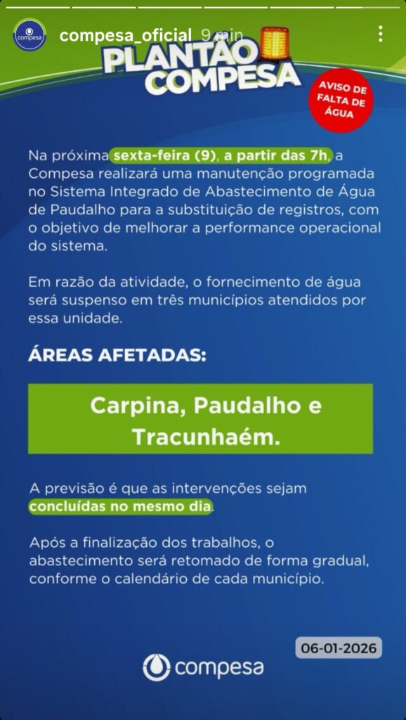 A Companhia Pernambucana de Saneamento (Compesa) informou que realizará uma manutenção programada no Sistema Integrado de Abastecimento de Água de Paudalho nesta sexta-feira, dia 9, a partir das 7h da manhã. Em razão do serviço, o fornecimento de água será temporariamente suspenso em três municípios da Zona da Mata Norte de Pernambuco.