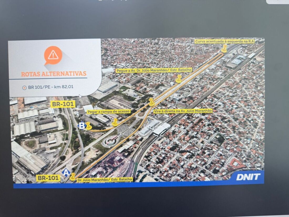 O Departamento Nacional de Infraestrutura de Transportes (DNIT) alertou nesta quarta-feira (22) que, na noite da quinta-feira (23), a partir das 20h, será realizada uma nova interrupção temporária de tráfego sobre o Viaduto Direcional situado no km 82,01 da BR-101, no trecho localizado em cima do Parque da Cidade, em Jaboatão dos Guararapes.