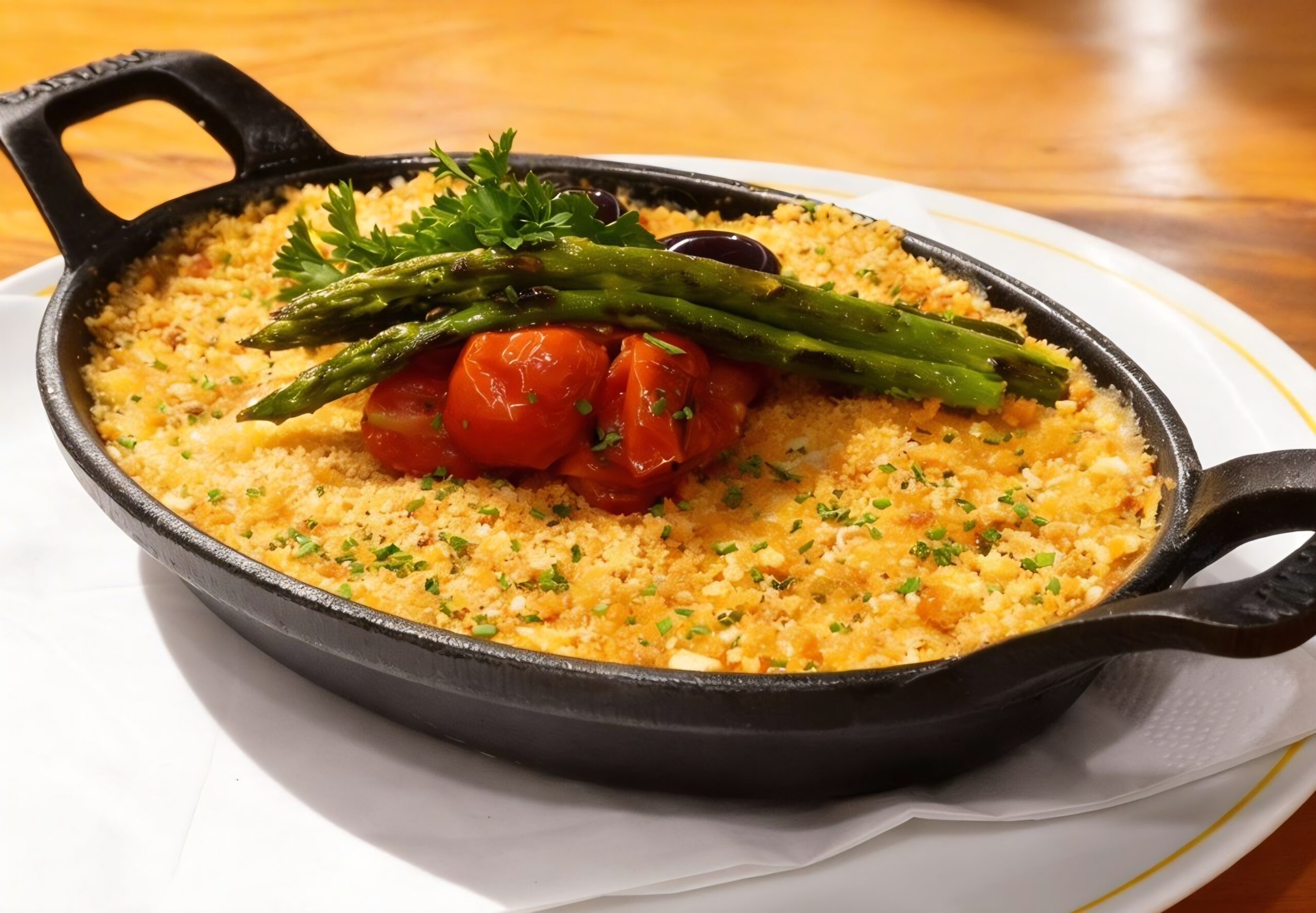 No Ninetto, o bacalhau aparece na lasanha com molho de alho-poró e toque cítrico, preparada em camadas leves, nas quais o peixe se integra aos demais ingredientes. O prato é servido com aspargos, tomatinhos confit e azeitonas pretas, compondo uma releitura de inspiração caseira.
